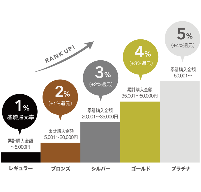 お買い物するほどお得になる!ランクアップ制でポイント還元率がどんどん上がります。