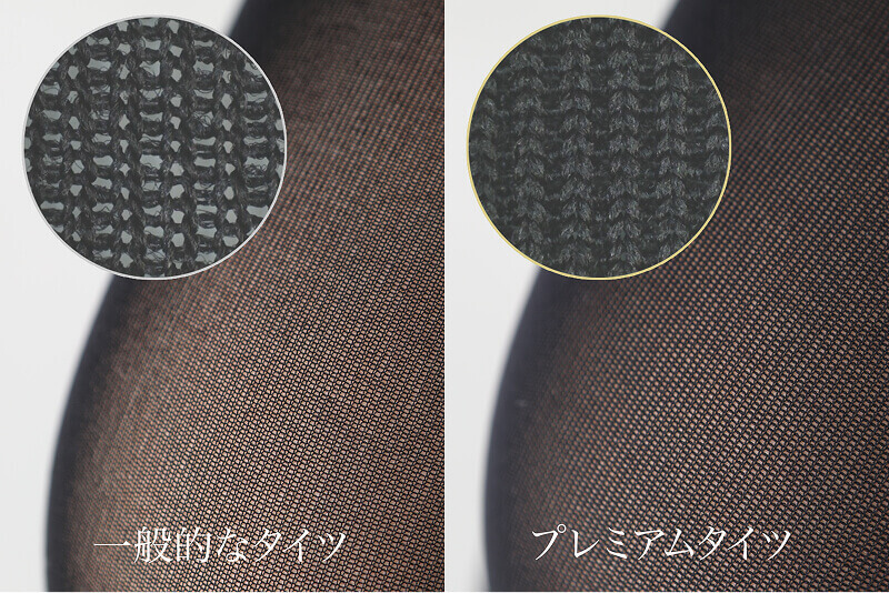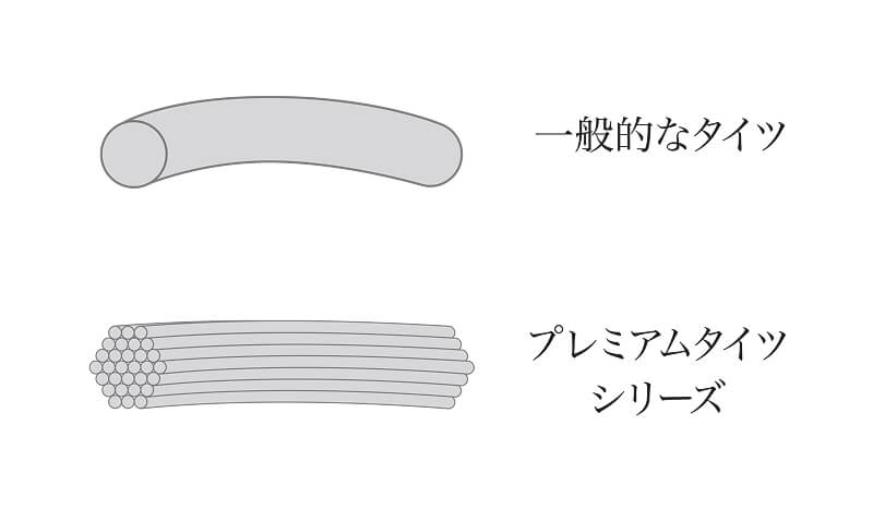 一般的なタイツよりも細い糸を組み合わせた、ハイマルチフィラメント糸。プレミアムタイツシリーズはその中でも最も細い糸を採用することで、さらに優しい肌触りを実現化しました。