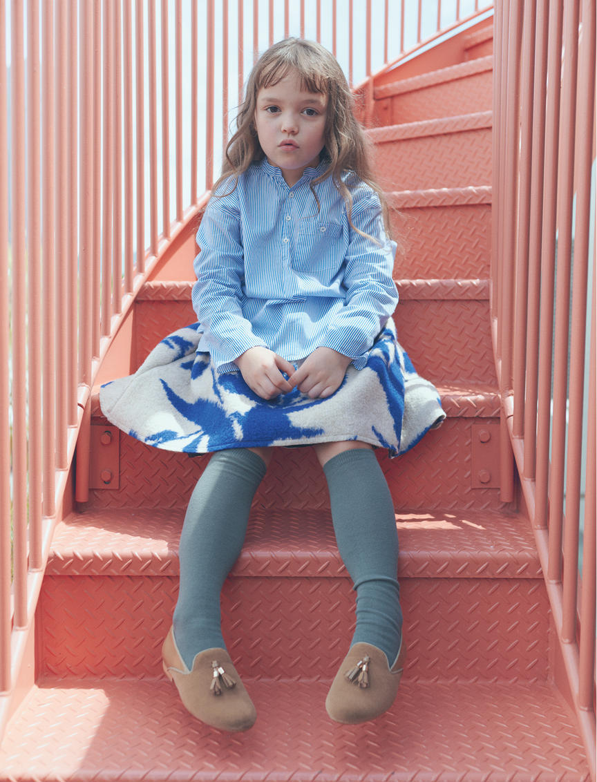 ベスト¥26,510(CARAMEL/キャラメル代官山) ブラウス¥26,400(minä perhonen/ミナ ペルホネン) スカート¥8,250〜(PETIT BATEAU/プチバトー・カスタマーセンター) シューズ¥7,040〜(LA CADENA/ミンバ)
