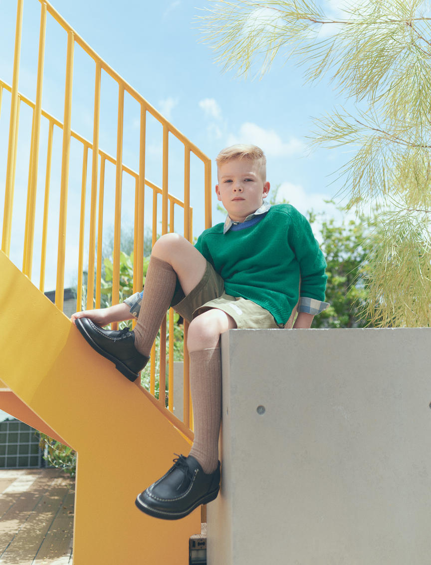 ニット¥60,170(CARAMEL/キャラメル代官山) 中に着たシャツ¥12,100〜(PETIT BATEAU/プチバトー・カスタマーセンター) ショーツ¥5,280(THE NORTH FACE/PLAY EARTH KIDS 恵比寿ガーデンプレイス) シューズ¥13,200(chamny/コンパス)