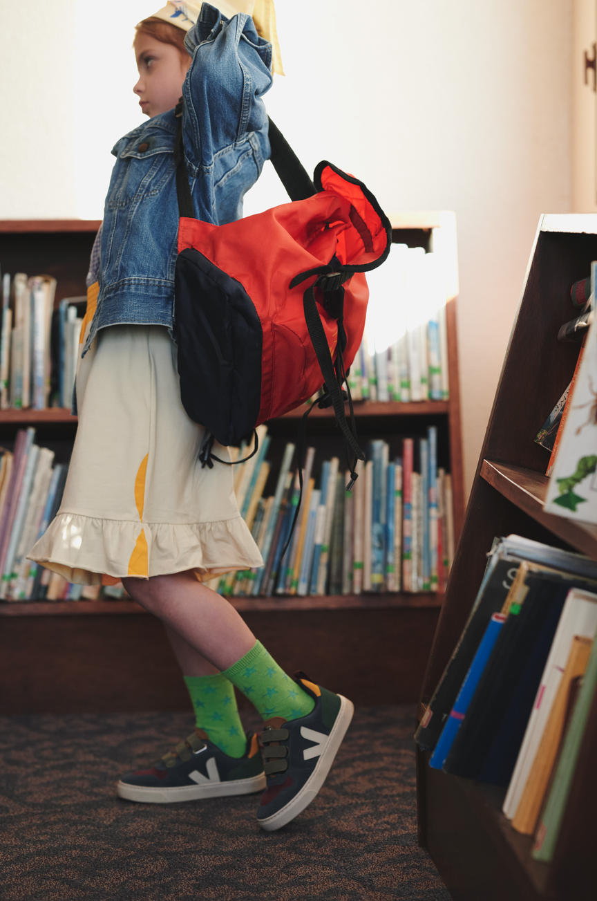 ヴィンテージのデニムジャケット¥9,900 リュック¥2,750(ともにmoc/モック) シャツ¥22,880(CARAMEL/CARAMEL 代官山) スカート¥9,900〜(WOLF&RITA) スカーフ¥7,260(weekend house kids./ともにミンバ) スニーカー¥18,700(VEJA/PLAY EARTH KIDS 恵比寿ガーデンプレイス)