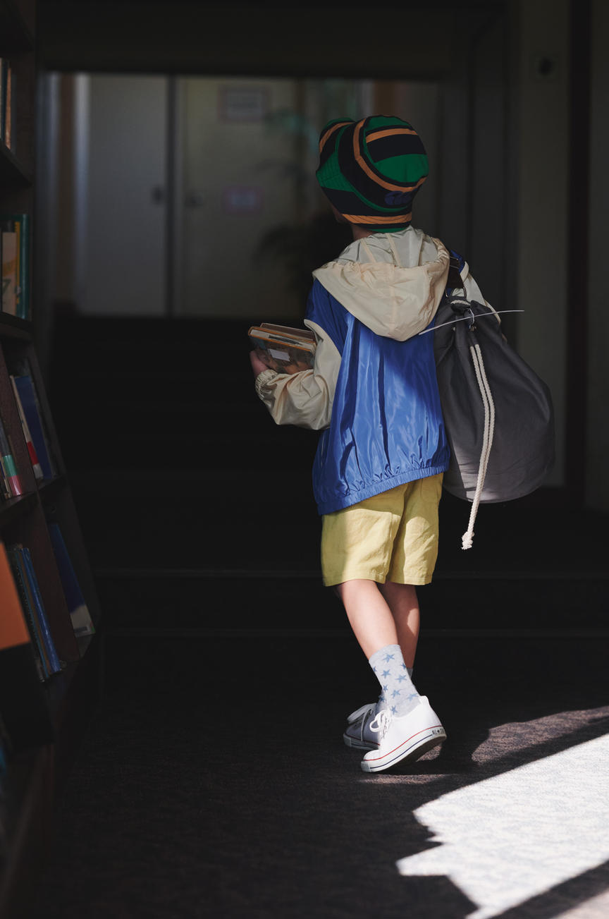 ウィンドブレーカー¥14,520(weekend house kids./ミンバ) Tシャツ¥1,990(GapKids/ギャップキッズ) ショートパンツ¥19,800(minä perhonen/ミナ ペルホネン) バケットハット¥4,950(canterbury/PLAY EARTH KIDS 恵比寿ガーデンプレイス) ダッフルバッグ¥15,950(CARAMEL/CARAMEL 代官山) スニーカー スタイリスト私物
