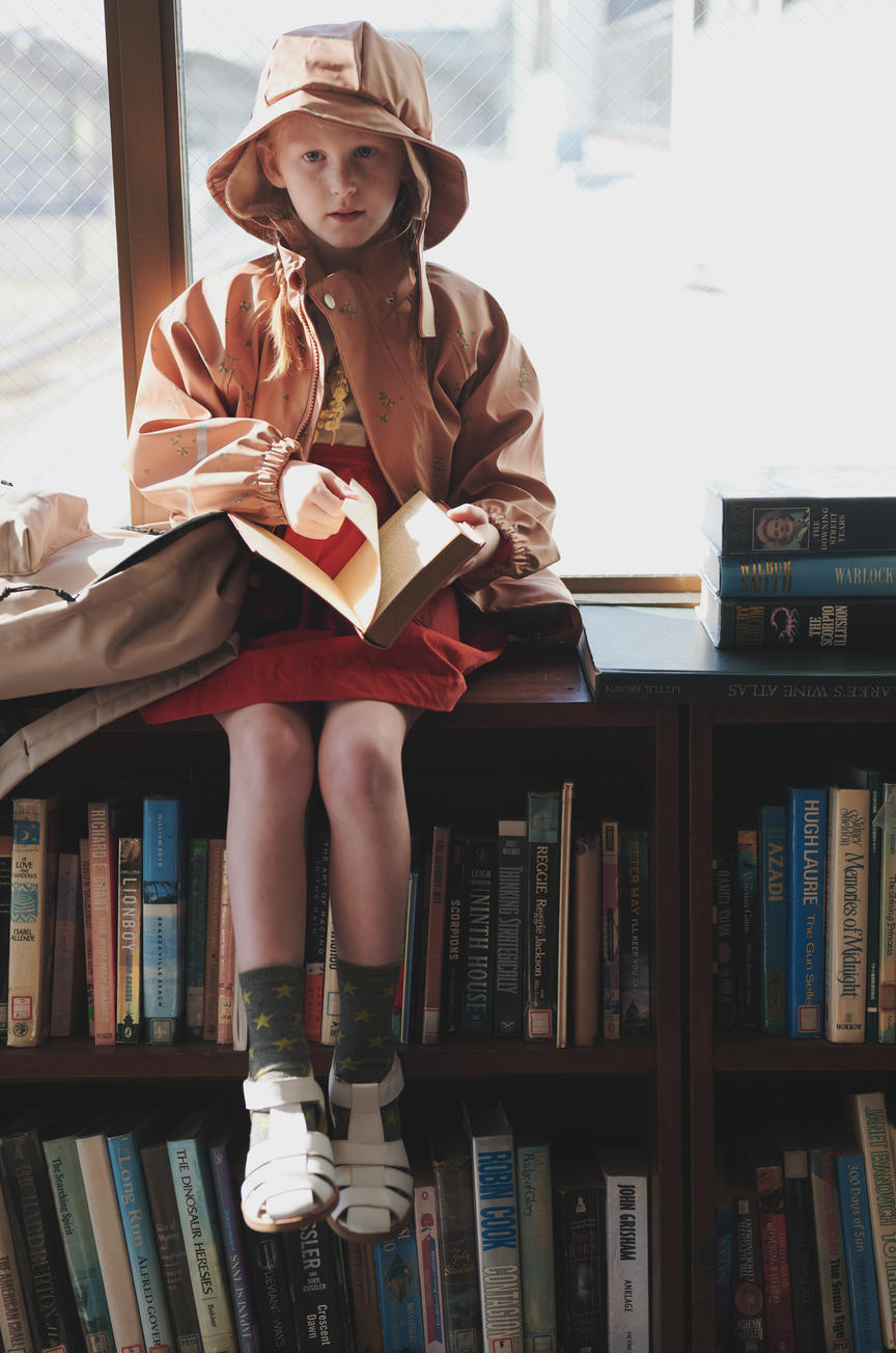 レインジャケット¥9,900 レインハット¥4,180(ともにgarbo&friends) バックパック¥11,000(HELLY HANSEN/以上すべてPLAY EARTH KIDS 恵比寿ガーデンプレイス) ブラウス¥19,800(minä perhonen/ミナ ペルホネン) スカート¥28,930(CARAMEL/CARAMEL 代官山) グルカサンダル¥11,000(chamny/コンパス)