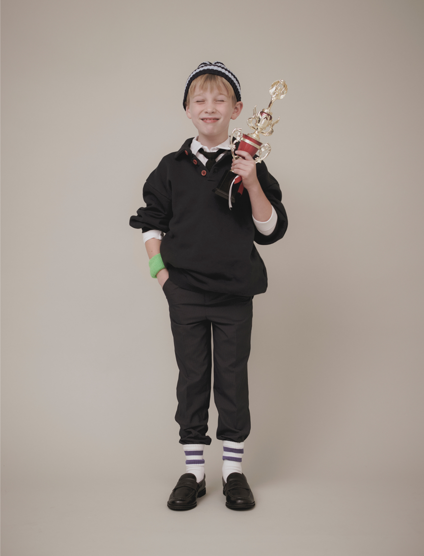 スウェット¥16,500(BOBO CHOSES/アイアム) シャツ¥3,900 スーツ¥18,000 ※パンツのみ使用(COMME CA ISM/ファイブフォックス カスタマーサービス) ニットキャップ¥6,050(Ron Herman/ロンハーマン) ローファー¥11,000(chamny /コンパス)