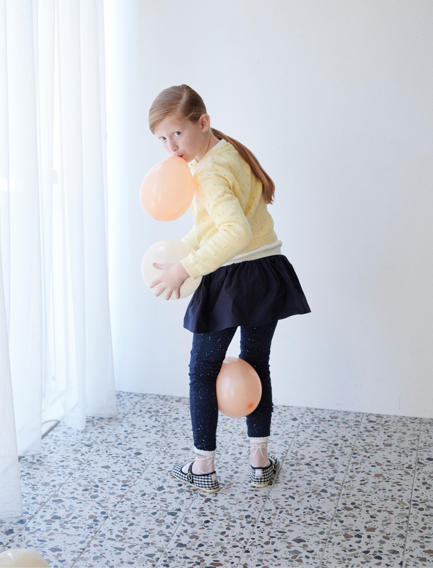 カーディガン¥5,990 レギンス¥2,490(ともにGapKids/ギャップキッズ) 中に着た長袖Tシャツ¥5,500〜(PETIT BATEAU/プチバトー・カスタマーセンター) ミニスカート¥11,880〜 (TANGERINE) シューズ¥7,040〜(LA CADENA/ともにミンバ)