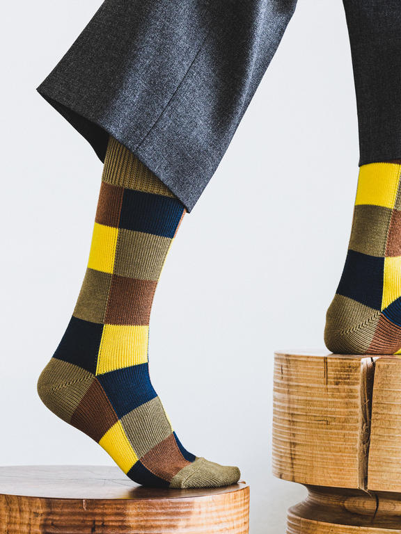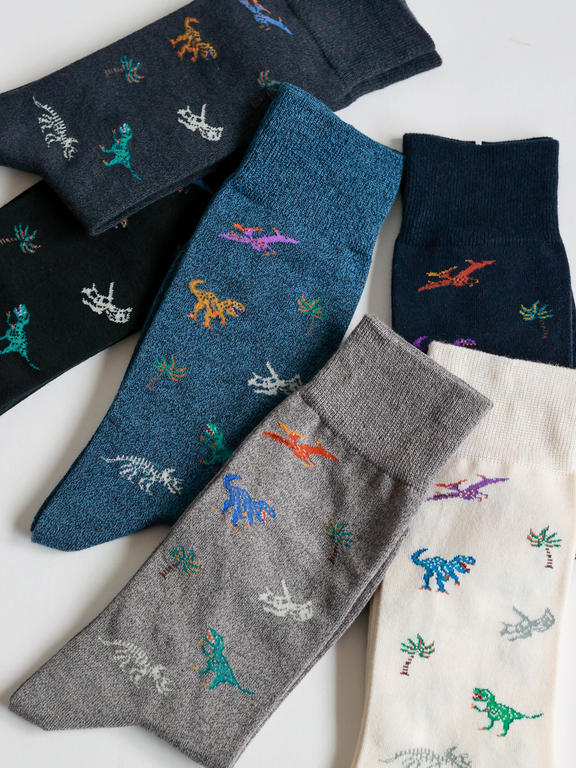 目を凝らしてみると数種類の 恐竜がリズムよく散りばめられた 定番人気の恐竜柄ソックス。 男心をくすぐるキャッチーな柄で、 ちらりと覗く足元に遊び心を。