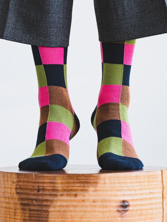 一見、派手な印象を与える クレイジーパターンですが 生地にボリューム感があるので カジュアルな雰囲気によく合います。 モノトーンのコーディネートと 明るい色の靴下を合わせると 目を引くスタイリングに。
