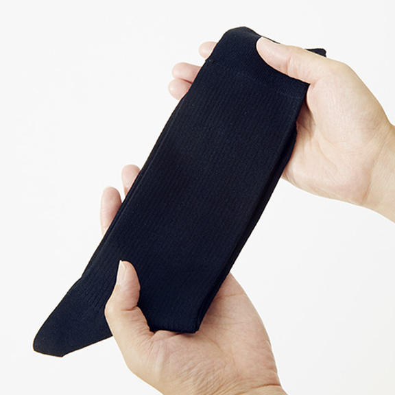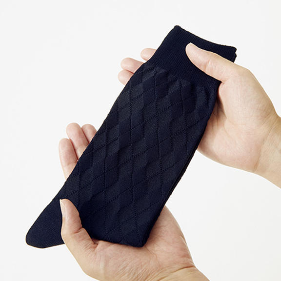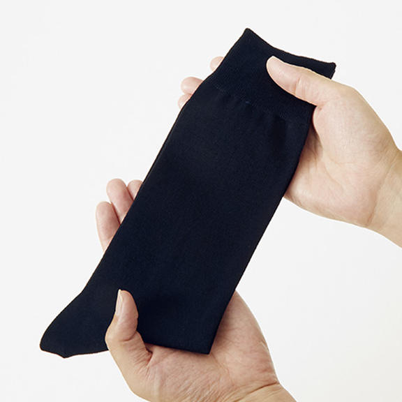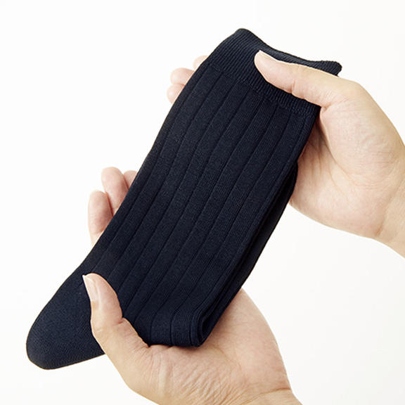 ネイビーやチャコールグレーのスーツに黒のカーフの革靴を履くとき、ブラックネイビーの靴下を合わせると足元が美しくまとまります。その上品な装いはビジネスシーンに最適です。