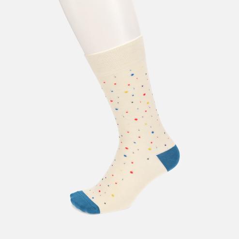 カラフルなドットソックス。異なる三種の大きさのドットをランダムに配置したアクセントのある一足。自然にファッションへ溶け込むデザインです。幅広いスタイルに合わせやすいソックスです。綿混なのでオールシーズン履けるメリットも。