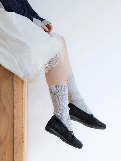 - ざっくりとしたナチュラルなスラブ糸で編んだローゲージソックスで、daisyオリジナルタグを付けました。オリジナルタグには「1歩踏み出して、安心して休んで」というメッセージを込めました。