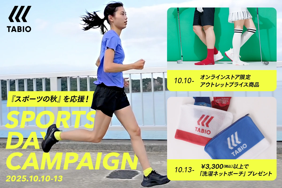 TOPICS 【オンライン限定】10月10日〜13日は「スポーツの日」キャンペーン 2025年10月10日(金)より TABIO SPORTSのアウトレット商品の 限定販売をはじめ、 10月13日(月・祝)の『スポーツの日』 からは¥3,300(税込)以上お買い上げの方に ロゴ入り洗濯ネットポーチを 先着でプレゼントします。 ※なくなり次第終了となります。 特集ページはこちら 公式オンラインストア・SNSアカウントで最新情報をチェックしよう 靴下屋チャンネル/新作商品・イベント情報 Tabioオンラインストア Tabio 公式X(旧Twitter) 靴下屋 Instagram Tabio Instagram Tabio Facebook 靴下屋公式YouTubeチャンネル トピックス一覧へ戻る