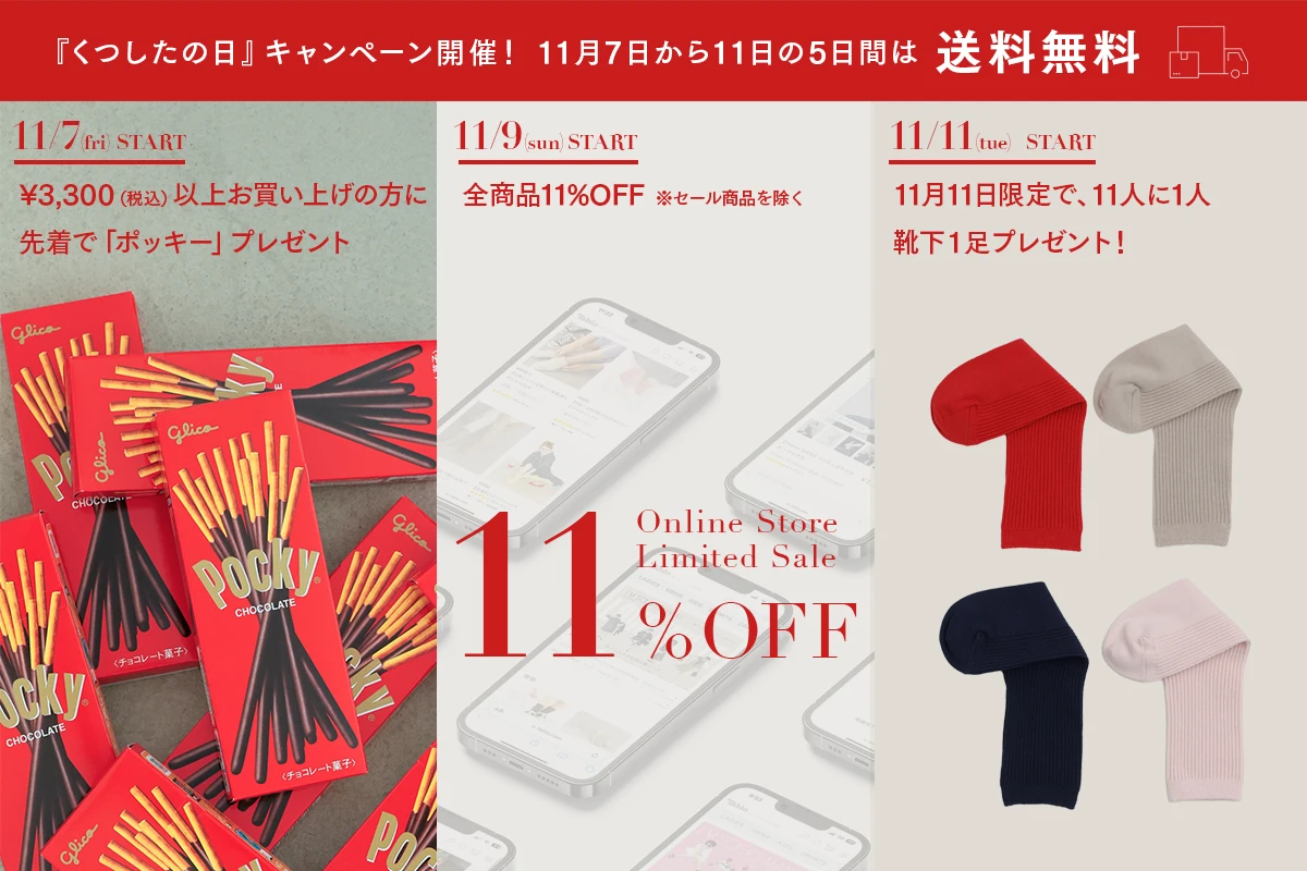 TOPICS 【オンラインストア限定】11月11日は『くつしたの日』3つのイベントと送料無料でお得なキャンペーンを開催! 11月11日の『くつしたの日』を記念して 2025年11月7日(金)〜11月11日(火) の期間、様々なイベントを開催します。 詳細は下記ボタンよりチェック!! キャンペーンページをみる 公式オンラインストア・SNSアカウントで最新情報をチェックしよう 靴下屋チャンネル/新作商品・イベント情報 Tabioオンラインストア Tabio 公式X(旧Twitter) 靴下屋 Instagram Tabio Instagram Tabio Facebook 靴下屋公式YouTubeチャンネル トピックス一覧へ戻る