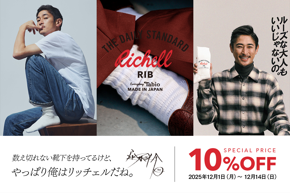 TOPICS 【Tabio MEN】リッチェルシリーズが 期間限定で スペシャルプライス! Tabio MEN公式アンバサダーの 俳優・窪塚洋介さんも愛用する “リッチェル”シリーズの 累計販売足数が20,000足を突破! これを記念して、 2025年12月1日〜14日まで 期間限定で10%OFFの スペシャルプライスに! 特集ページはこちら 公式オンラインストア・SNSアカウントで最新情報をチェックしよう 靴下屋チャンネル/新作商品・イベント情報 Tabioオンラインストア Tabio 公式X(旧Twitter) 靴下屋 Instagram Tabio Instagram Tabio Facebook 靴下屋公式YouTubeチャンネル トピックス一覧へ戻る
