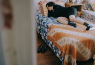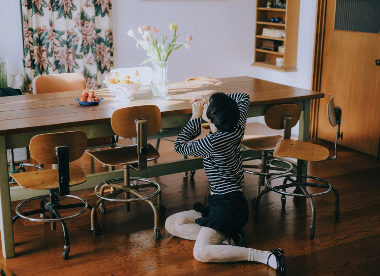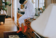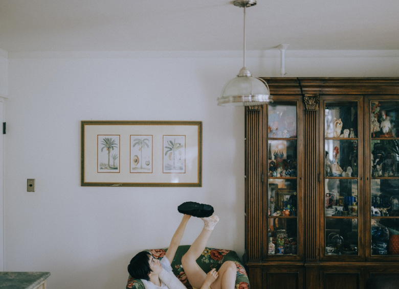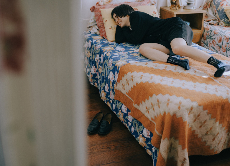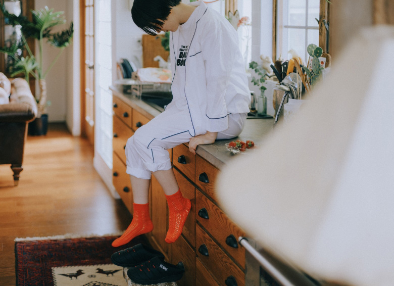花柄の靴下を重ね履きして、