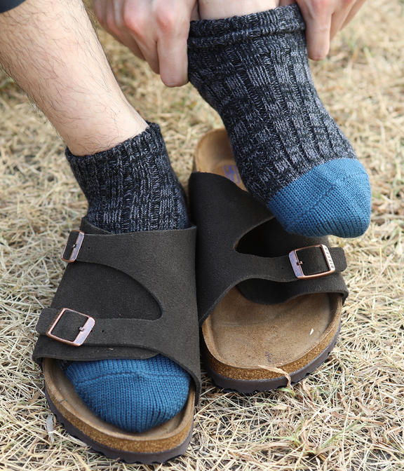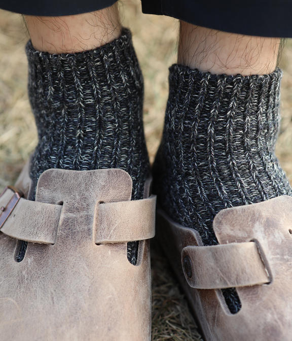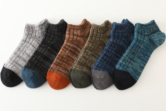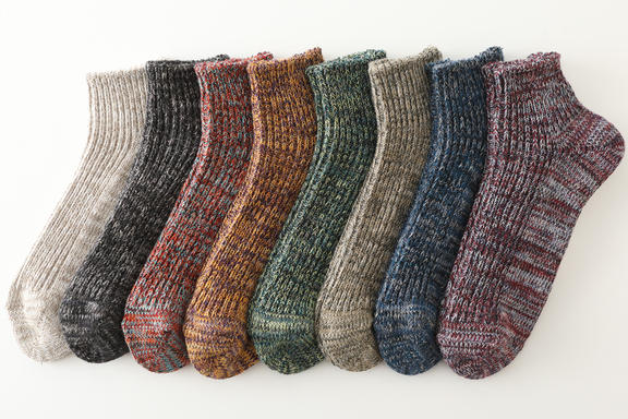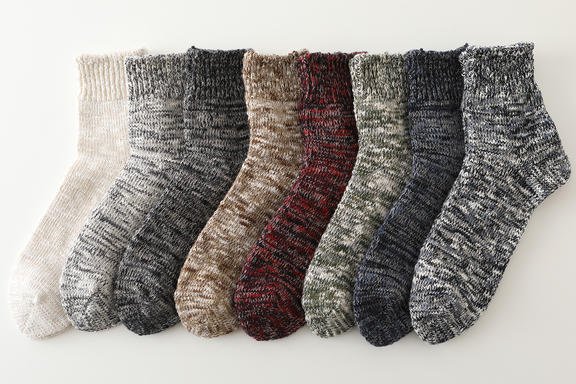 本格ラグのようなナチュラルでタフな表情を、 フシ感が特徴の、「ヘンプコットン」スラブ糸で再現。 スラブミックスショートソックス ¥990(税込)