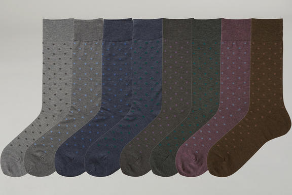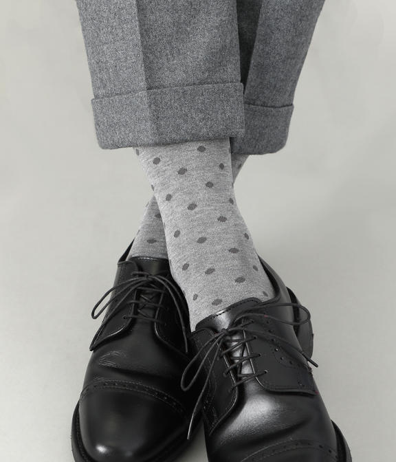 洗練された印象のドット柄を編みで表現。 メランジ素材のニュアンス感が大人の酒落感を醸す。 K220 “Melange Cotton" 綿ポルカドット柄ソックス ¥1,100(税込)