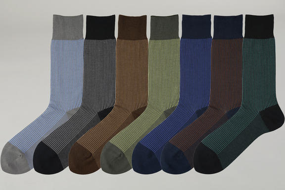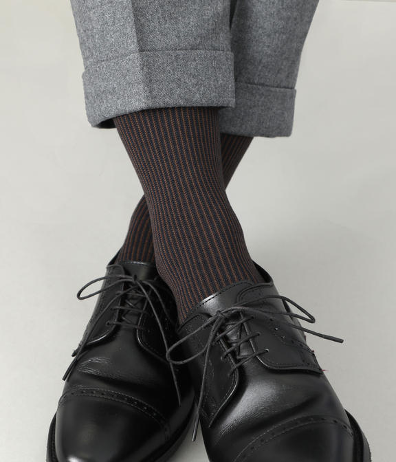 スマートなストライプを奥行き感あるJQ編みで。 品のある上質なコットン素材ゆえ、程よく「抜ける」。 JQ220 "Silky Cotton" JQ細ストライプソックス ¥1,320(税込)