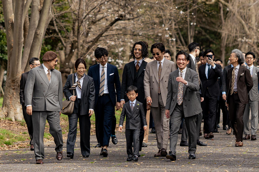 背広を愛する紳士が、業界関係者・お客様の境なく集まり、日本の風情を感じる場所を背広を着用し散歩して交流を深める会です。コロナ禍を経て背広に袖を通す機会が激減する中で”装いを愉しむ場を作りたい”という想いから有志が集いスタートしています。初めは普段の飲み屋でのひょんな話からでしたがメンバーの想いが強くさらに多くのご協力のもと実現できました。運営メンバー、カメラマンは皆手弁当(会社の業務とは切り離して)で行なっており、メンズドレスという業界を盛り上げたいという気持ちでこの会を開催、運営しています。難しいものではなく、お気に入りの背広を纏って好きな服の話で盛り上がる。背広、洋服好きなら誰しもが楽しめるようなアットホームな集まりです。