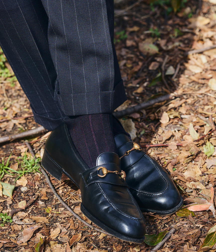 今日は着用したスーツとタイ、ニットの色に合わせた2トーンカラーのホーズを選びました。裾幅がある程度あるスラックスに対しては、しっかりと長さのあるホーズを選ぶことが多いですね。素材や編み地は、ドレススタイルなら薄くて編み地がシンプルなものがメイン。カジュアルは靴に左右されるところが大きいですが、編み地に凹凸があったり、素材感や色が立っていたりと、装いに合わせて変化をつけて愉しんでいます。