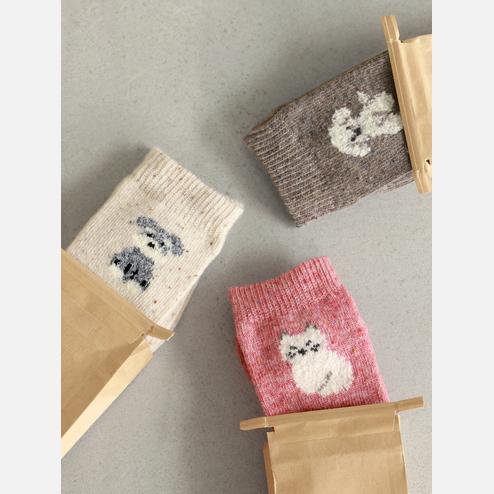 ウールのカラーネップ入りのベースに、もこもこの糸でいぬとねこを編みこんだソックス🐶🐈!