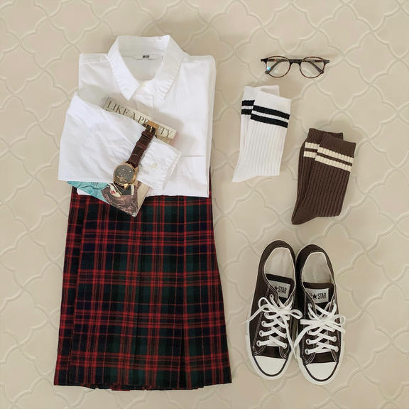 定番になりつつあるトラッドスタイルを 意識しました。スニーカーで、 よりカジュアルさを出し日本の女の子の リアルクローズに近いコーディネート 写真に仕上げました。